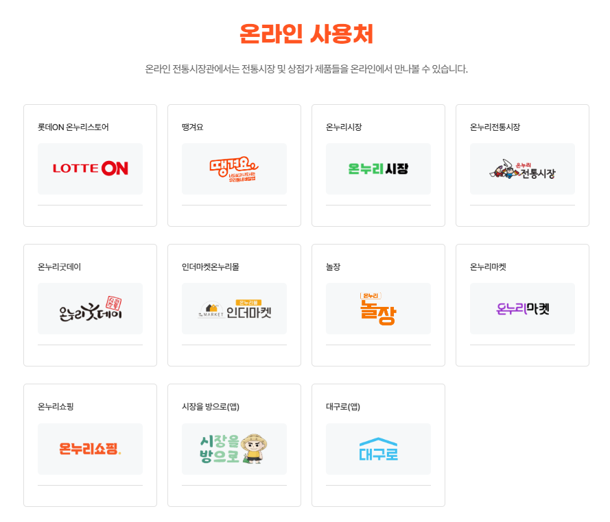 현재 디지털 온누리상품권은 아래와 같은 공식 온라인 가맹 플랫폼에서 사용이 가능합니다.