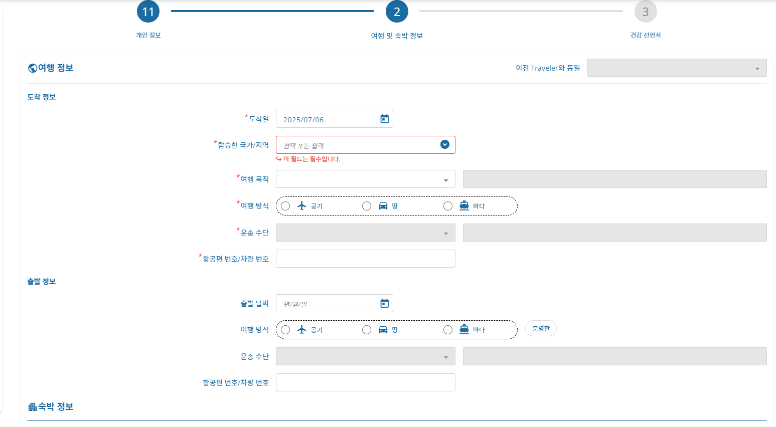 여행 방식/운송수단/항공편 번호: 도착 정보와 동일하게 입력